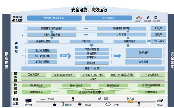 管道完整性管理系统,是基于管道完整性管理理念(国际上广泛认可的最佳管道安全管理模式)进行研发,。通过不断的采集管道各类相关数据,持续识别和评估管道面临的风险因素,采取有效的风险消减措施,确保管道的安全风险可控。涵盖了数据采集、高后果区识别、风险评价、维护维修、完整性评价等关键环节,辅助管理者全面掌握管道运行情况,有效管控运营风险,保障管道运行安全,达到安全、经济、高效的目标。