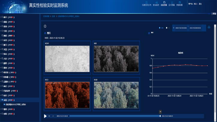 真实性检验实时监测系统可集中管理布设在不同区域的仪器设备,视频相机可对观测区域环境及仪器实时监测、可对视频相机云台进行远程操控;可实时接收、汇聚多光谱相机观测数据并在线计算NDVI指数;具有仪器异常与数据异常提醒;支持用户管理及角色管理。